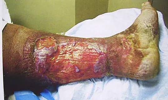 This 37 year old male presented with severe leg wounds of more than two years duration. His condition was complicated by diabetes and obesity. He delayed seeking treatment because he feared he would need an amputation. He was treated with progressive wound management.